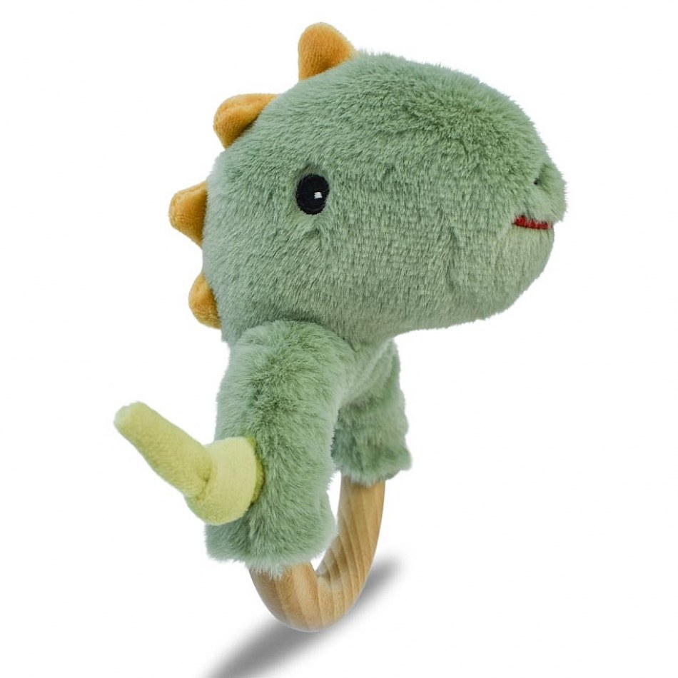Koala Dreams Snuggle Buddy Minty Dinosaur Wooden Ring Rattle combines soft plush material, a cute dinosaur design with a wooden ring handle, and a soothing rattle noise, ideal for babies 0 and above.